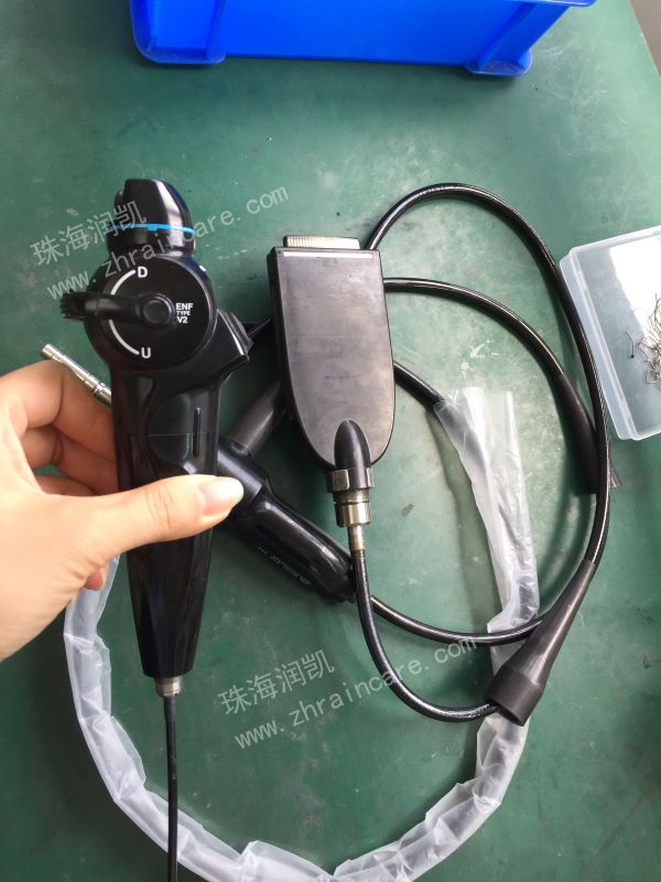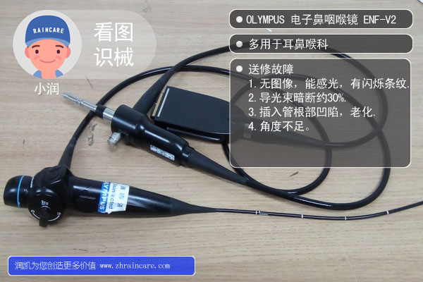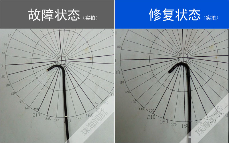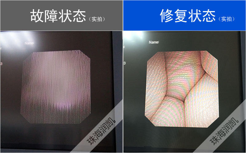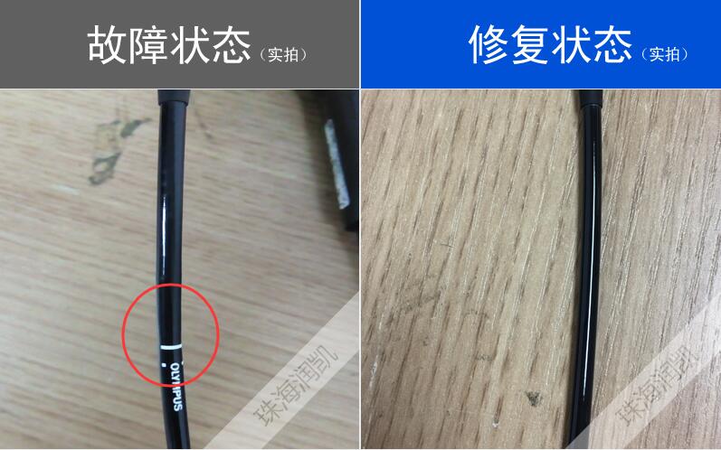實測故障:1.無圖像,能感光,有閃爍條紋;2.導光束暗斷約30%;3.插入管根部凹陷,老化;4.角度不足。