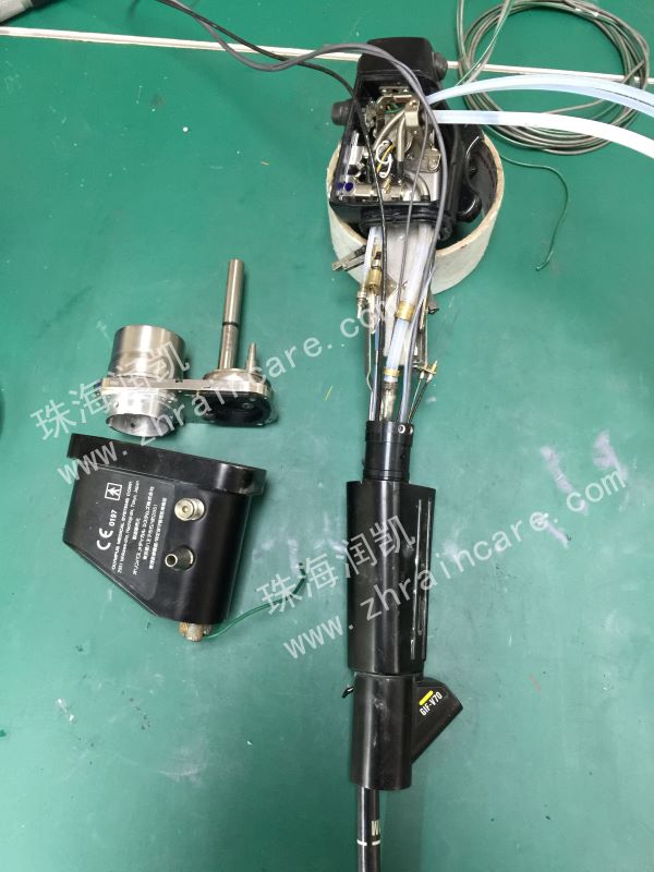 【實測故障】1.圖像布滿黑點,CCD老化故障;2.2、3號開關盒脫落;3.接線座保護盒缺失;4.彎曲橡皮脹大無彈性;5.插入管發黃結晶。