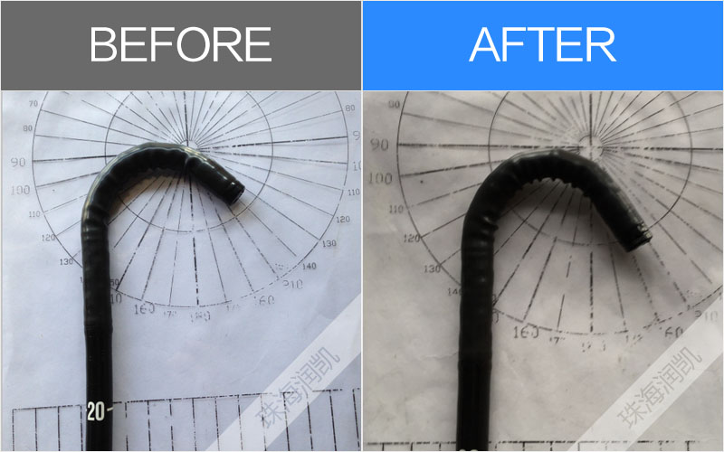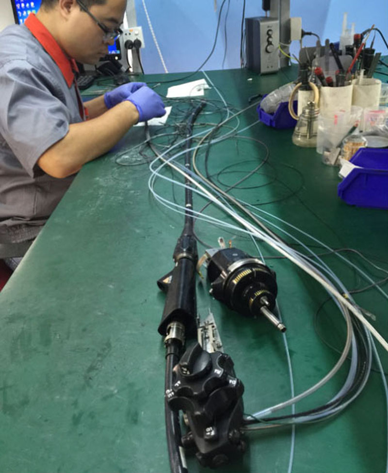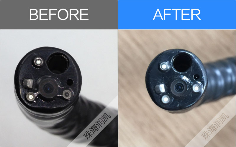 【實測故障】1.圖像閃屏;2.CCD右側導光束暗斷; 3.鉗子管2-5CM處凹折;4角度不足;5.網套多處斷絲、開口;6.插入管表面多處有輕度劃痕。