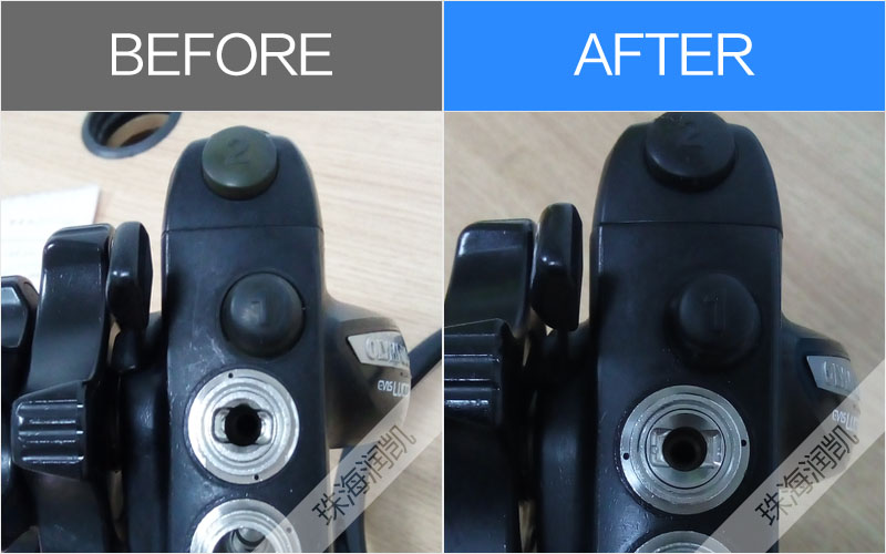 【實測故障】1.彎曲橡皮漏水、發(fā)黃結(jié)晶;2.調(diào)焦放大功能失效;3.插入管結(jié)晶發(fā)黃,表皮多處起皺;4.導光束暗斷約30%;5.接頭插針氧化發(fā)黑;6.吸引座輕度磨損;7.插入管護套末端破損;8.1、2、3、4號按鈕外皮老化發(fā)黃。